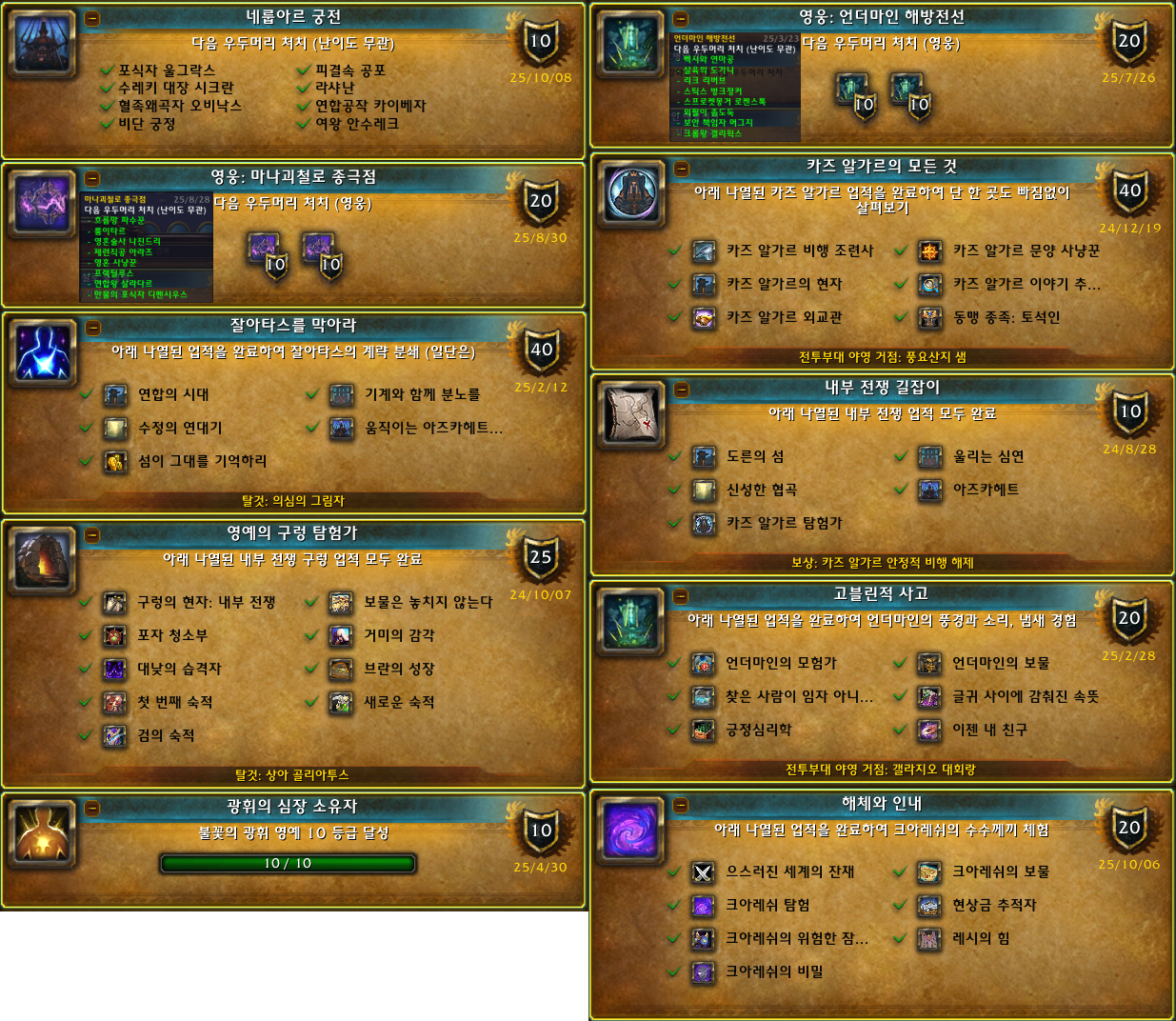 하위 업적들 어떤 것이 있는지 확인해보니 10개의 하위 업적들(공격대 던전 업적들과 [광휘의 심장 소유자]를 제외하면 모두 하위 메타 업적들)이 있습니다.