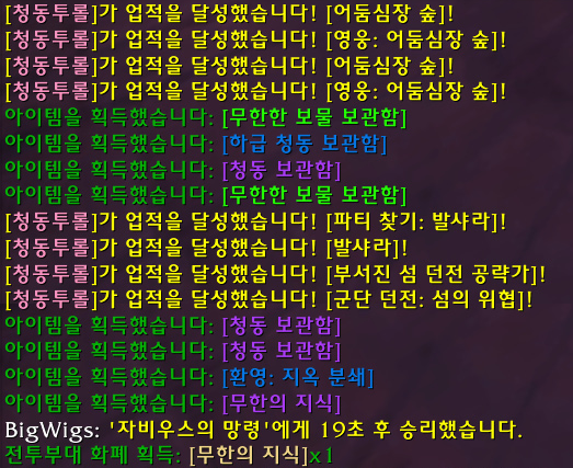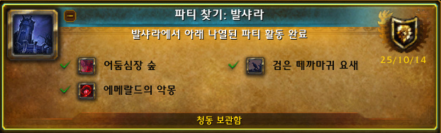 다음으로 발샤라 지역의 던전들을 무작위 던전 신청으로 영웅 검은 떼까마귀 요새에 갔고, 공격대 찾기로 에메랄드의 악몽을 클리어하고, 마지막으로 무작위 던전 신청으로 영웅 어둠심장 숲을 클리어 하니