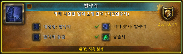| '살게레이 사령관의 지옥멸시 정복'(와우 군단리믹스 대장정 완료 업적 [지옥에서 돌아오다] 달성 보상 형상세트) (0) | 2025.10.14 |