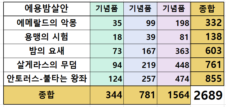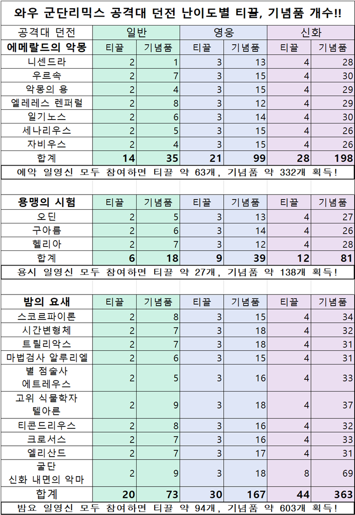 아래는 공격대 던전별 일영신 기념품 개수를 총정리해보았습니다.