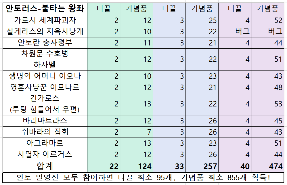 '안토러스-불타는 왕좌(안토)' 일영신 모두 참여하면 티끌 최소 95개, 기념품 최소 855개 획득할 수 있습니다.