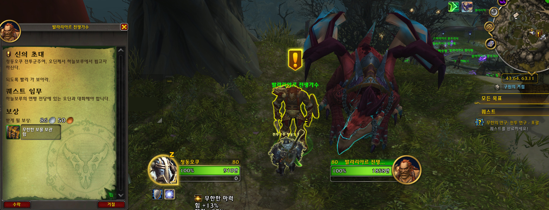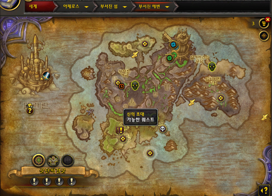 부서진 해변에 '마이애브'한테 '군단척결의 용사' 퀘스트 받고 '모라타리' 덕분에 과정을 스킵해서 완료했지만,