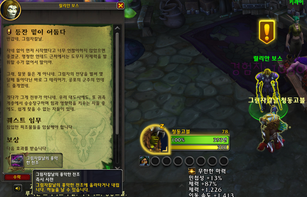 '공포스러운 침입자'가 도적 직업 탈것 퀘스트의 시작입니다.