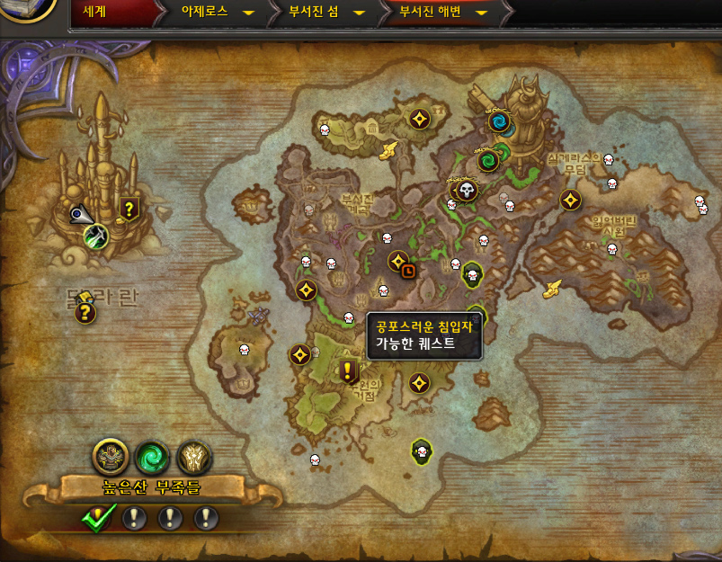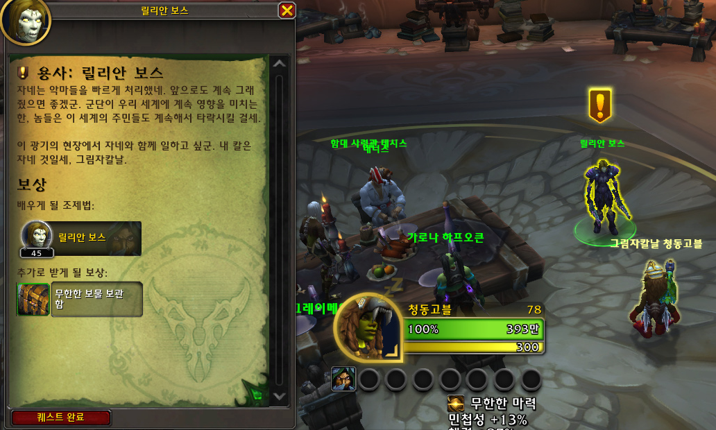 그리고 부서진 해변에 가서 마이애브한테 '군단 척결의 용사들' 퀘스트를 받고 모라타리가 과정을 스킵해주고 퀘 완료했습니다.