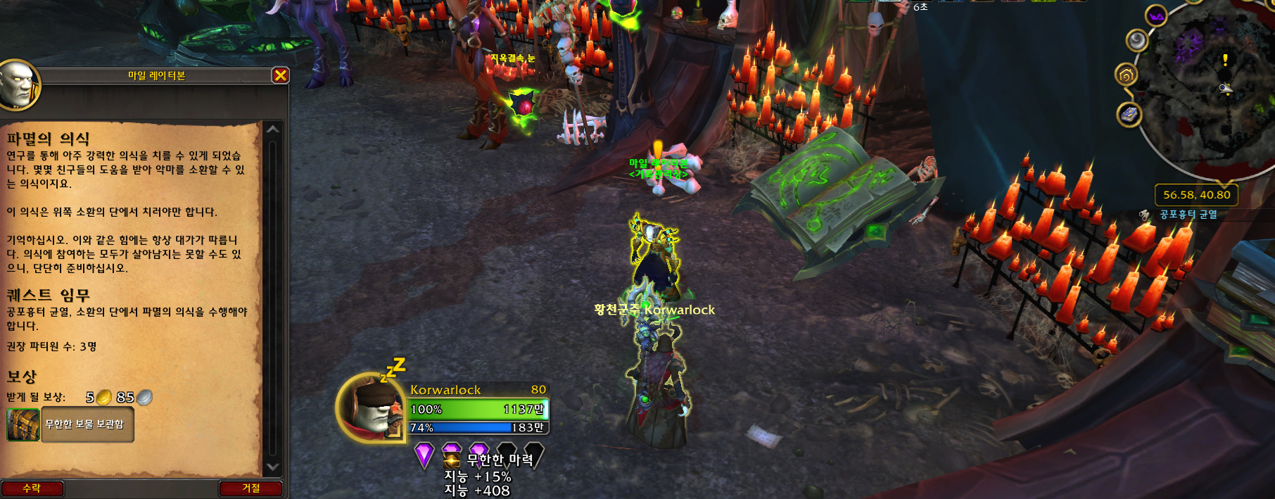 흑마법사 직업전당인 '공포흉터 균열'에 느낌표가 보여서 가보니 '마일 레이터본'이 '파멸의 의식' 퀘스트를 줬습니다.