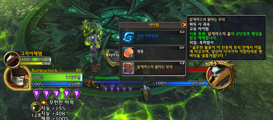 '살게라스의 불타는 보석' 파괴 흑마법사 유물 무기 히든 형상템 획득!!