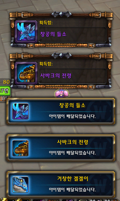 게임에 접속한 상태로 와우 공식홈페이지 상점 페이지에서 결제했더니, 아래처럼 아이템들이 즉시 배달되었습니다.