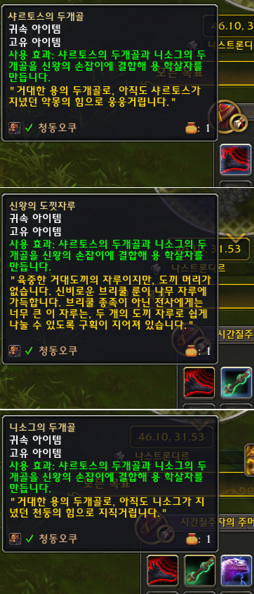저번주에 샤르토스를 쓰러뜨리고 두개골을 획득했고, 어제 용맹의 전당 영웅에서 도낏자루를, 오늘 니소그를 쓰러뜨리고 두개골을 획득했습니다.