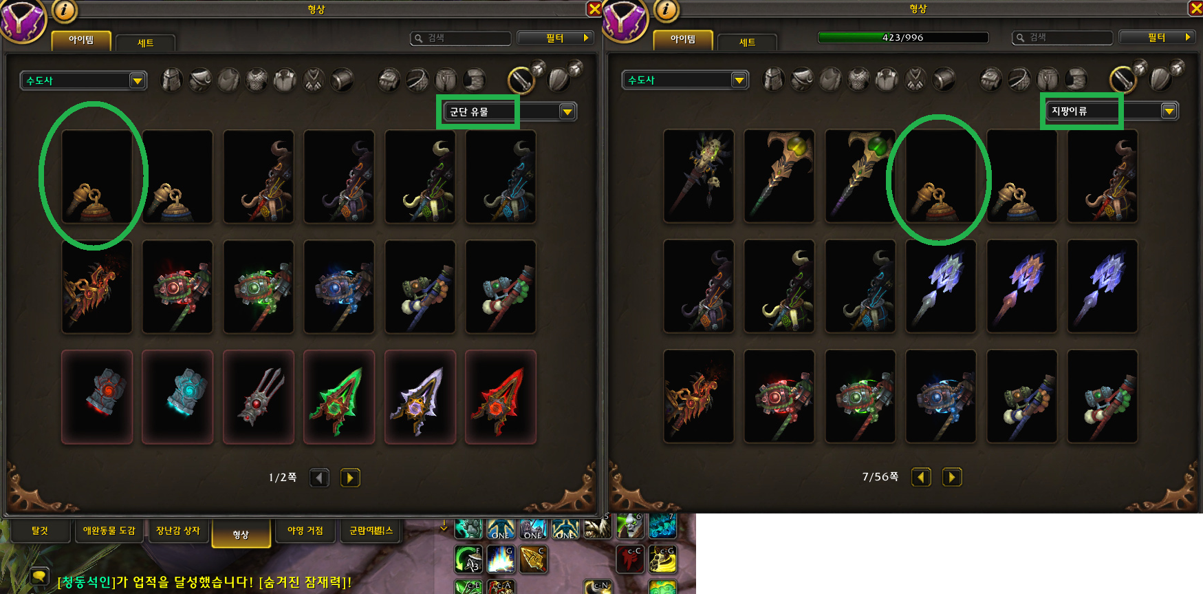 군단 유물과 지팡이류 목록에 히든 형상이 잘 있습니다.👍👍