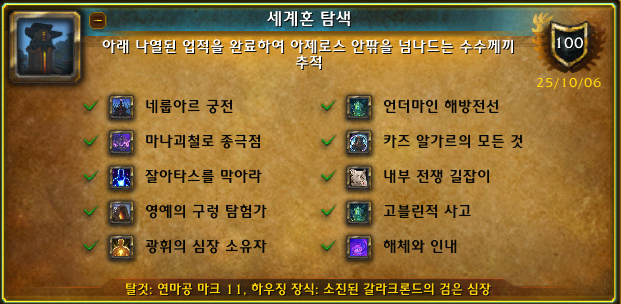 아래 나열된 업적을 완료하여 아제로스 안팎을 넘나드는 수수께끼 추적.