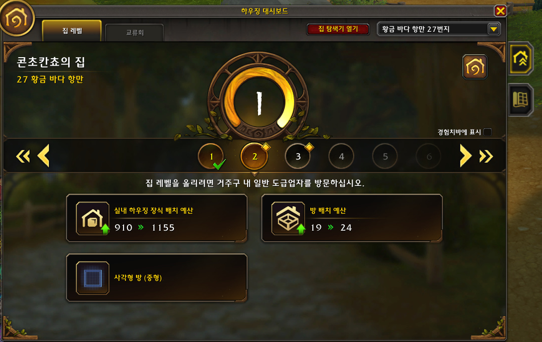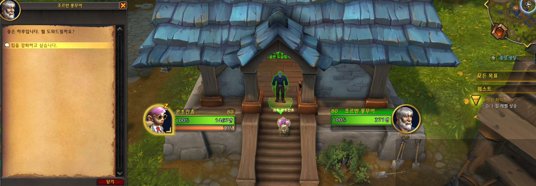 집 레벨을 올려보라고 해서 중앙 광장의 '조르반 롱무어<일반 도급업자>'한테 말 걸어서 집을 강화했습니다.