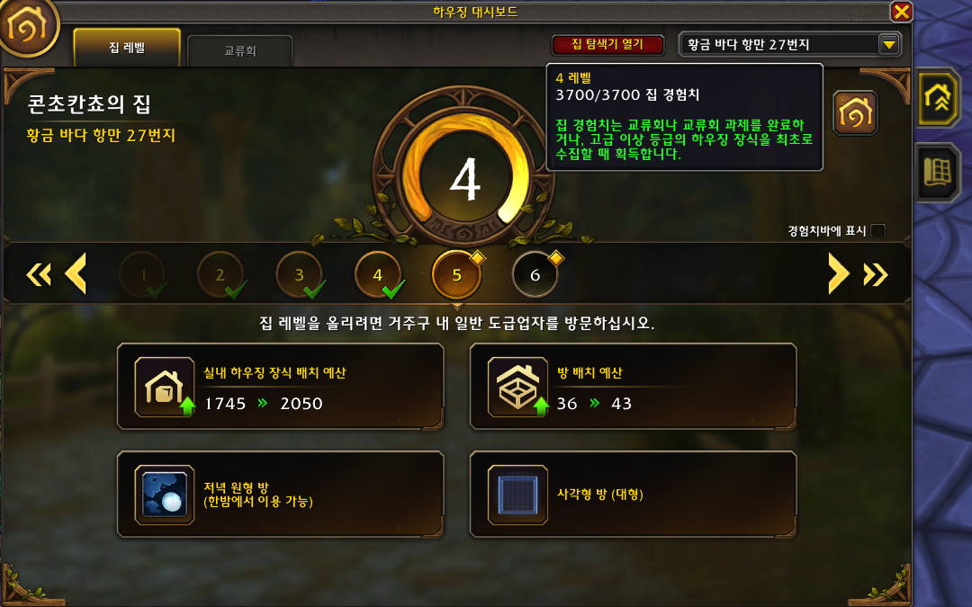 그렇게 하우징 5레벨이 되기까지 경험치 10이 남았습니다.(3690/3700)