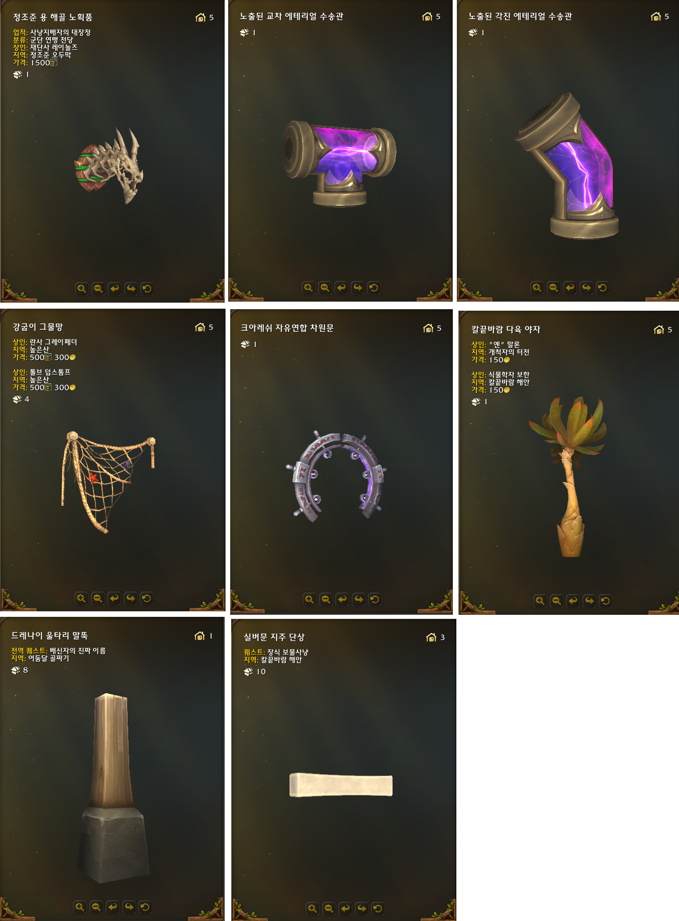 정조준 용 해골 노획품, 노출된 교차 에테리얼 수송관, 노출된 각진 에테리얼 수송관, 강굽이 그물망, 크아레쉬 자유연합 차원문, 칼끝바람 다육 야자, 드레나이 울타리 말뚝, 실버문 지주 단상.