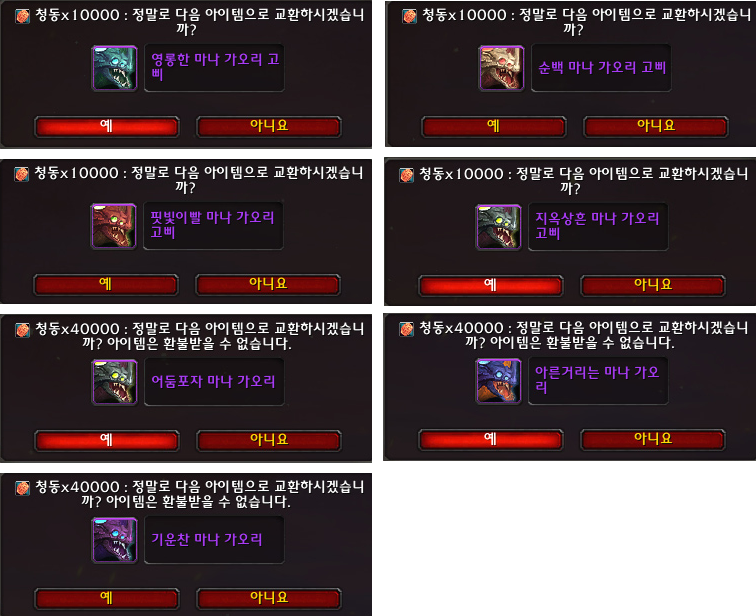 4마리는 각 10000(1만)청동이고, 3마리는 각 40000(4만)청동입니다.