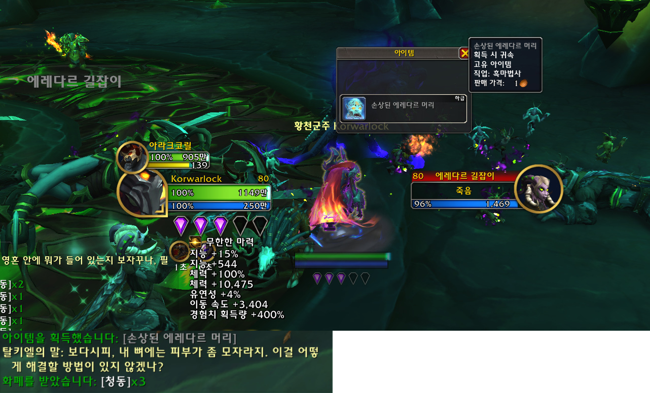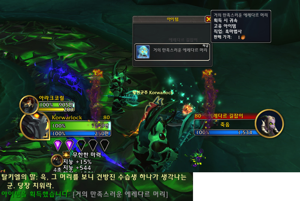 머리를 획득할 때마다 악흑 유물무기의 '탈키엘'이 말을 합니다.