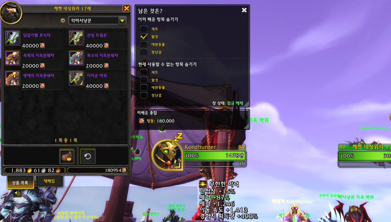 와우 군단리믹스 무한의 시장에 있는 탈것 상인 '헤멧 네싱워리 17세'의 판매 목록을 보니 'What's Left?' 애드온으로 이미 배운 탈것을 숨긴 결과, 6개 탈것만 남은 것이 확인되었습니다!