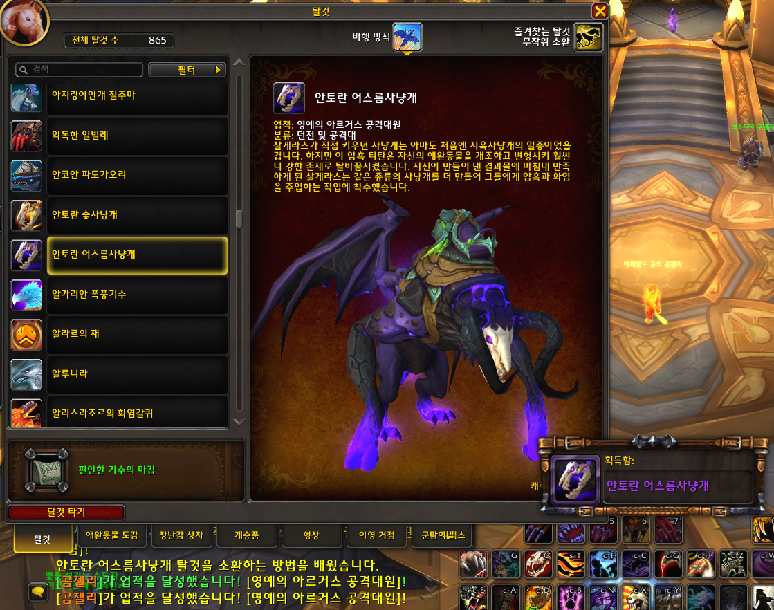 이렇게 영예의 아르거스 공격대원 업적을 달성하고, 보상으로 탈것을 획득했습니다.