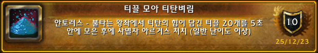 최소 2명부터 가능하다고 하고, 사람들이 많을수록 쉽게 할 수 있는 업적이 [티끌 모아 티탄벼림]입니다.
