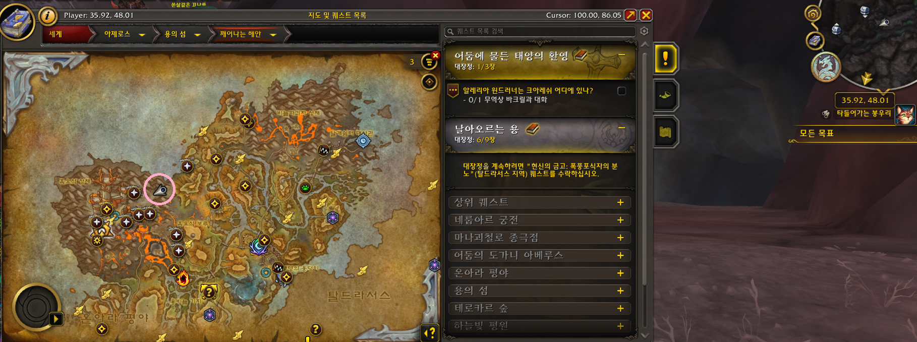 자랄레크 동굴 서쪽에 암흑불길 색의 보주를 찾을 수 있습니다. 자랄레크 동굴로 가서 아래 와우헤드 링크를 누르고 댓글에 있는 좌표를 복사하고 와우 채팅창에 /tomtompaste를 입력하여 뜨는