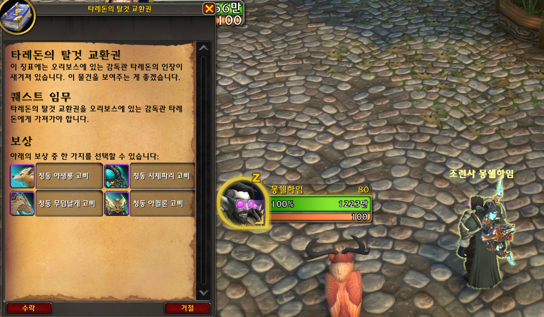 "오리보스에 있는 감독관 타레돈을 찾아가 보상으로 교환할 수 있습니다."