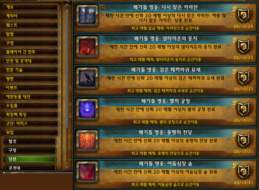 어둠심장 숲, 용맹의 전당, 별의 궁정, 검은 떼까마귀 요새, 넬타리온의 둥지, 다시 찾은 카라잔 쐐기 20단 이상을 클리어하면