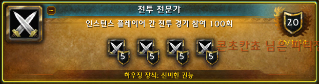 인스턴스 플레이어 간 전투 경기 참여 100회.