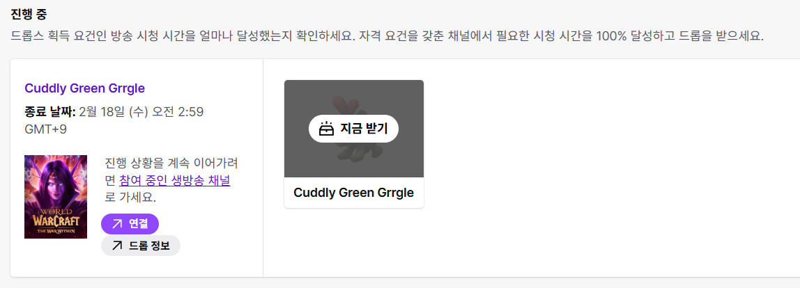 트위치와 블리자드 계정을 연결한 상태에서(https://account.battle.net/connections) 1/21(수) 새벽 3시~2/18(수) 새벽 3시동안 트위치에서 와우 관련 방송(https://www.twitch.tv/directory/category/world-of-warcraft)을 4시