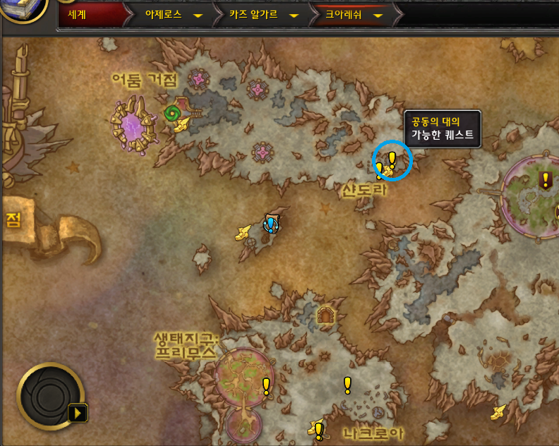 ★만약 이 역삼각형 느낌표가 보이지 않는다면, 크아레쉬 지역에서 할 수 있는 사이드 퀘스트 '공동의 대의'를 진행해서 완료하면 되겠습니다. 위치는 아래 파란 동그라미입니다.
