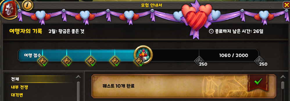 퀘스트 10개 완료 100점 /1060점!