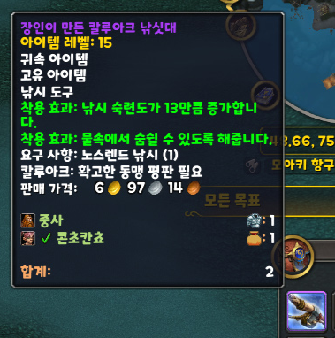 내부전쟁 확장팩부터 낚시 일지(아래 낚시 창)에 낚싯대와 같은 낚시 도구를 장착시킬 수 있게 되었습니다.