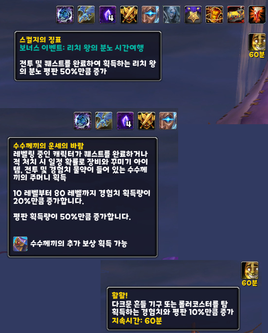 26년 1월 29일부터 2월 5일 오늘 오전까지 리치왕의 분노 시간여행 던전 이벤트가 열렸었는데, 이때 '스컬지의 징표(전투 및 퀘스트를 완료하여 획득하는 리치왕의 분노 평판 50%만큼 증가)' 버프와 '수수께끼의 운세의 바람(평판 획득량이 50%만큼 증가)' 버프, 그리고 '다크문 축제 활활!(평판 10%만큼 증가)' 버프 덕분에 엄청난 속도로 평판 작업을 할 수 있었습니다.