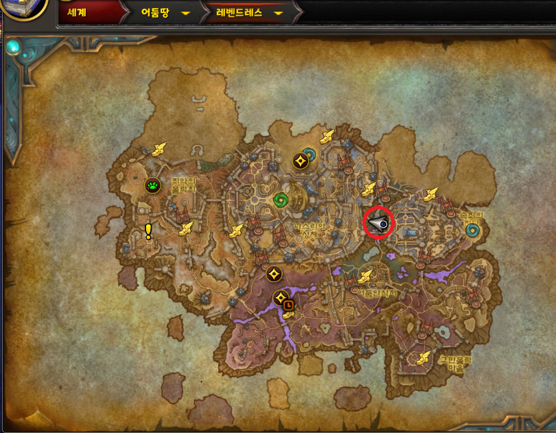 며칠 전부터 부캐릭들로 어둠땅 레벤드레스 지역의 아래 위치(빨간색 동그라미)서에 탈것 작업을 하고 있었습니다.