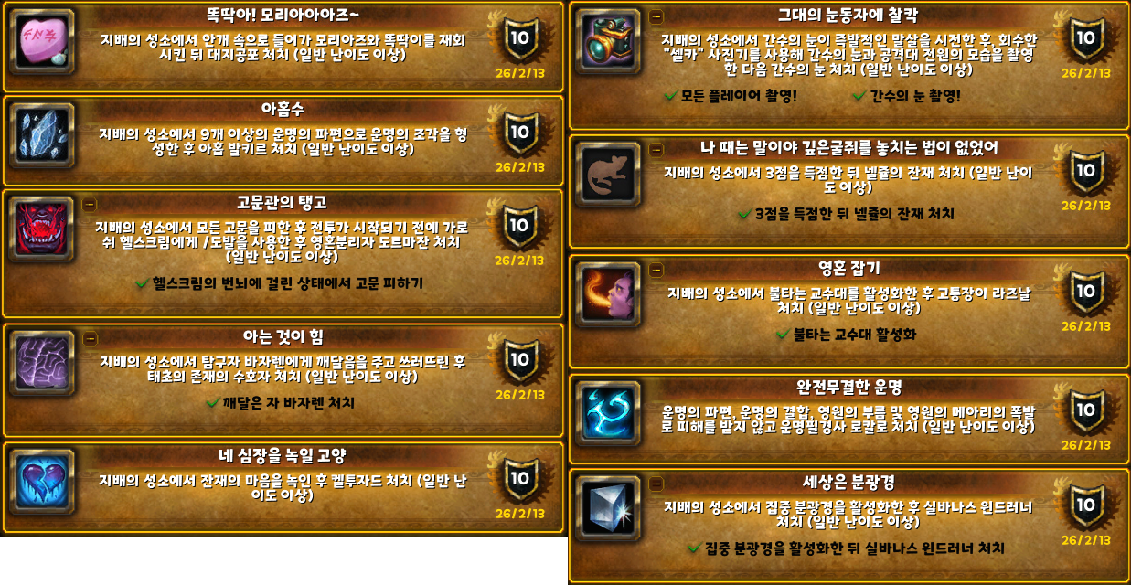 지배의 성소 막직만 가봐서 업적들이 하나도 체크되어있지 않았습니다.
