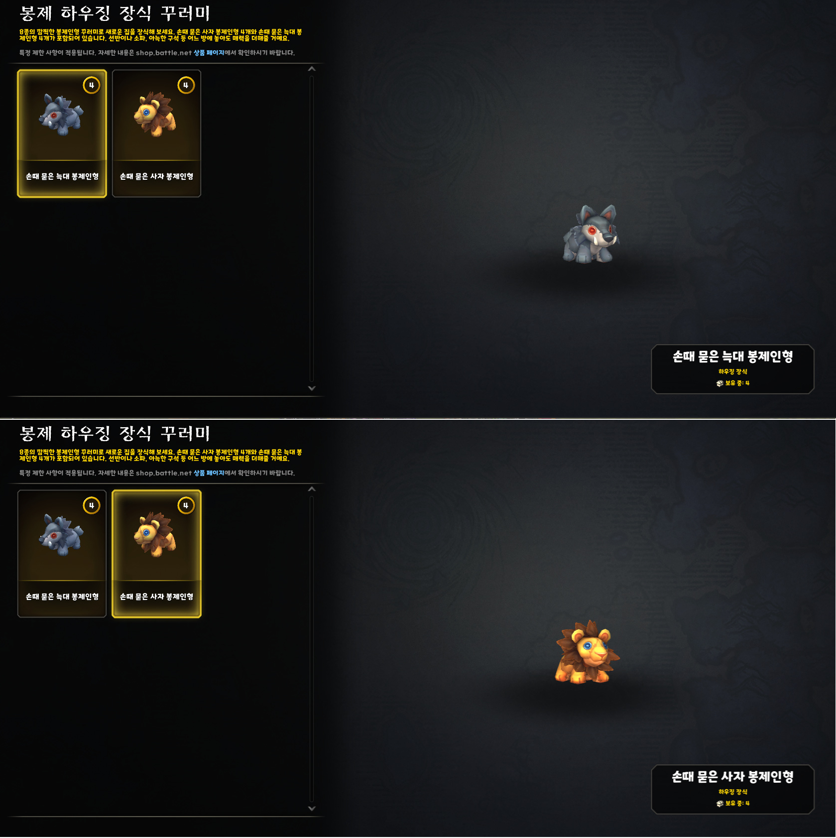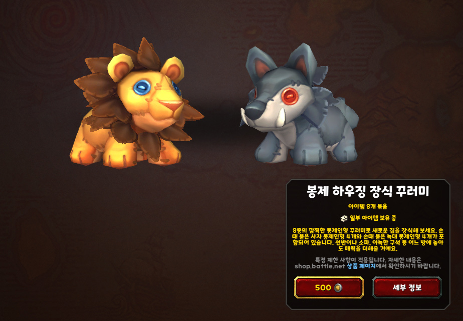 인형 하나에 보금주화 100개로 구입할 수 있지만, 늑대와 사자 인형 4개씩 총 8개 묶음 판매하는 '봉제 하우징 장식 꾸러미'를 구입했습니다.