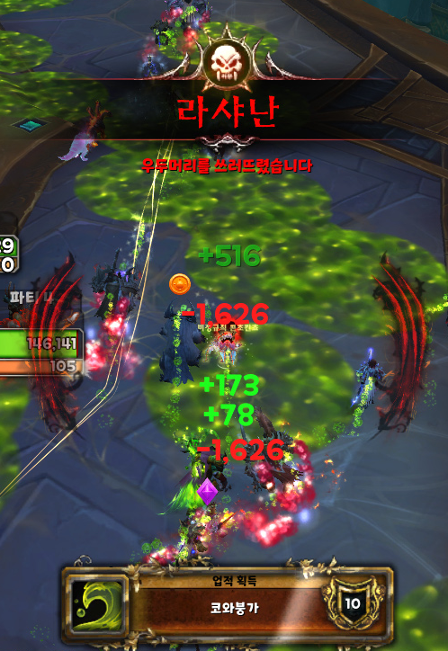 업적 추적으로 빨간색이던 업적 진행이 하얗게 바뀌었다면 라샤난을 극딜해서 쓰러뜨리면 업적 [코와붕가]을 획득할 수 있습니다.