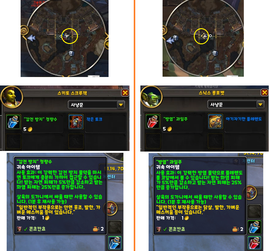 2넴 '살육의 도가니'는 경기장 입구에 있는 고블린 npc '스키토 스크루잭'과 '스닉스 롱포켓'한테서 각각 '"감전 방지" 청량수'와 '"방염" 과일주'를 최소 1개를 구입합니다. 가격이 저렴하고 변수를 대비하기 위해 2~3개 정도 구입 추천드립니다.