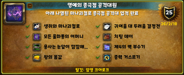 최신 확장팩 영예의 업적들을 완료한 것은 와우 플레이하면서 처음입니다!