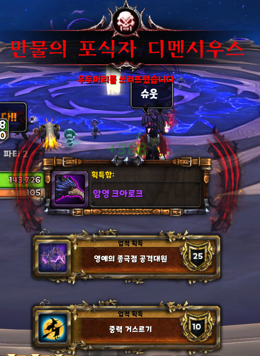 아무튼 업적 추적으로 빨간 글씨에서 하얀 글씨로 바뀐 것을 확인하고 1페이즈 잘 넘기고 2페이즈 후 마지막 페이즈 때 디멘시우스를 극딜해서 업적 [중력 거스르기]를 획득했습니다.