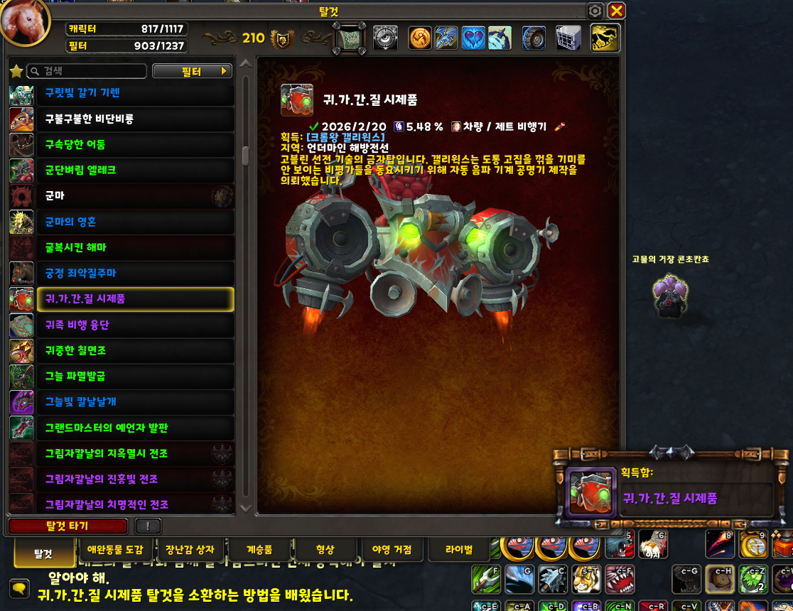25년 2월 27일에 내부전쟁 2시즌 '언더마인 해방의 날' 패치가 적용되면서 추가된 '언더마인' 지역에 있는 공격대 던전인 '언더마인 해방전선'에서 막넴 '크롬왕 갤리윅스'가 모든 난이도(공찾~신화)에서 낮은 확률로 드랍하는 탈것이 있습니다.