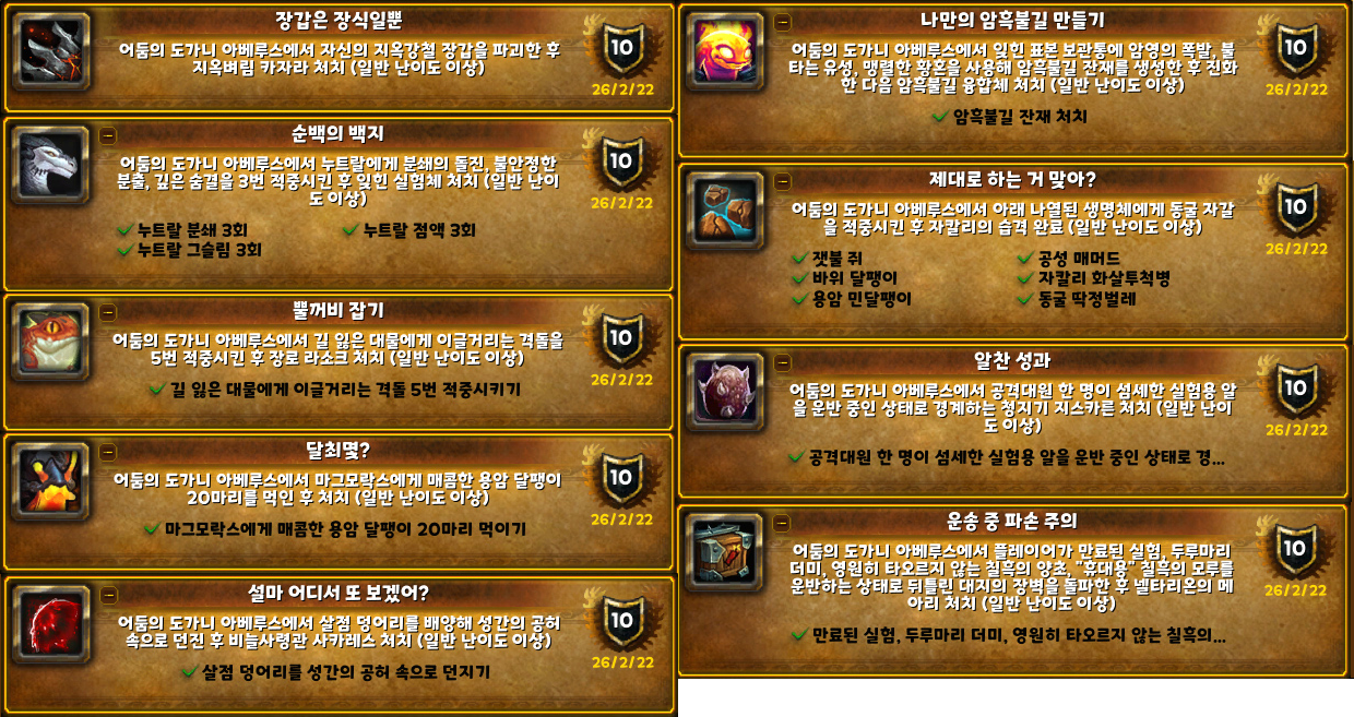 아래 나열된 어둠의 도가니 아베루스 공격대 업적 완료.