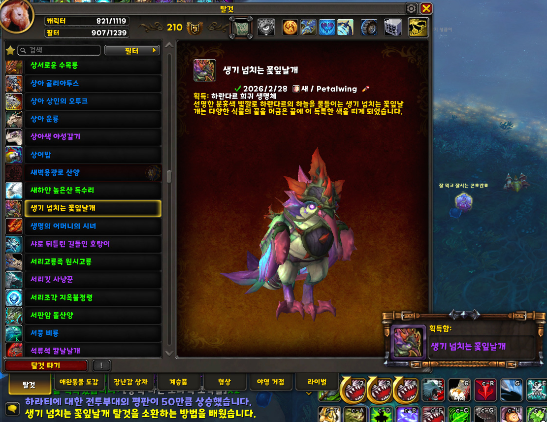 | '오염되지 않은 숲포복자'(와우 한밤 하란다르 지역 '포자생성 보관함' 획득 탈것) (0) | 2026.02.28 |