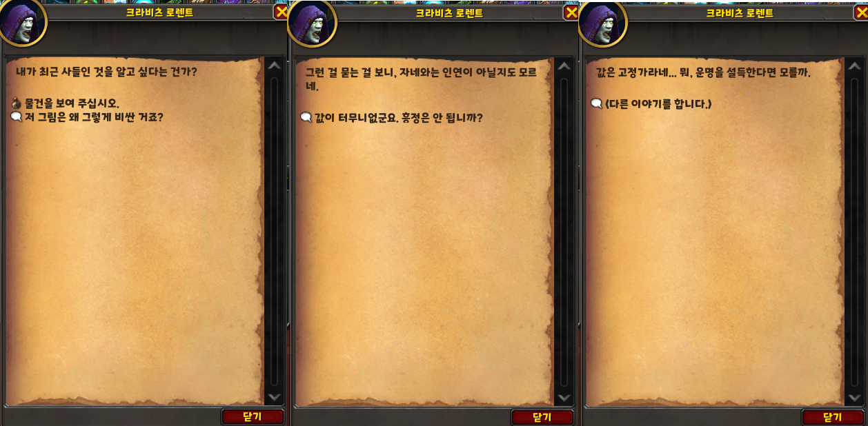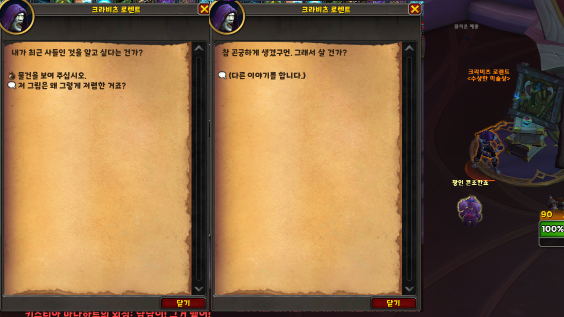 출처와 잡설.출처:시크릿 디스코드. https://www.wowhead.com/news/how-to-buy-the-shuhalo-perspective-painting-for-less-than-gold-cap-380630수수께끼 - 슈할로의 자화상 그림 싸게 사기. 한밤 던전 중 죽음의 골목이란 곳