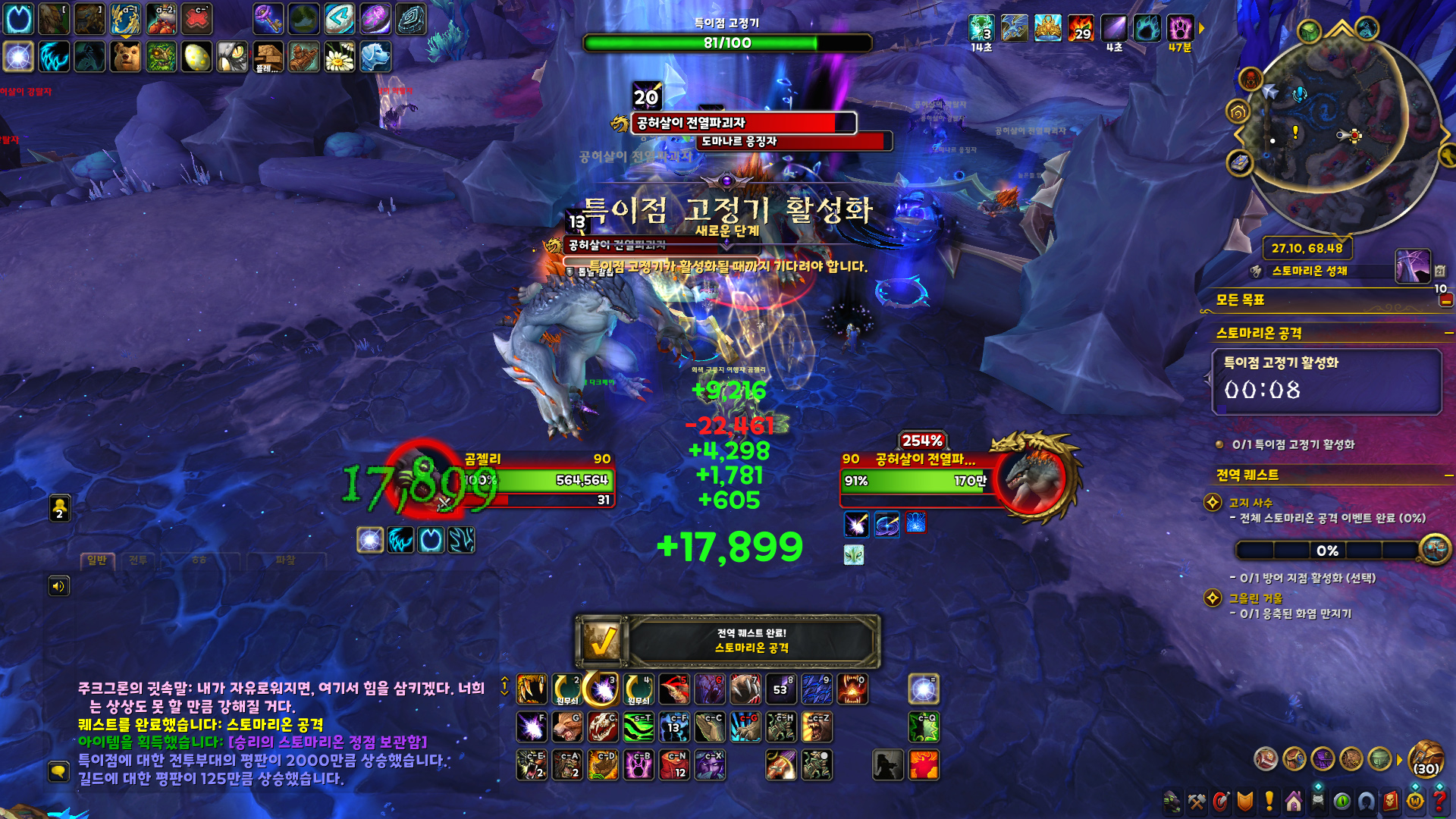 제한 시간 동안 몹들의 공격을 잘 방어하면 승리하게 되고, 보상으로 주 1회 '승리의 스토마리온 정점 보관함(보라 상자)'을 줍니다.