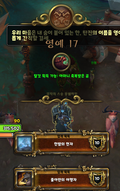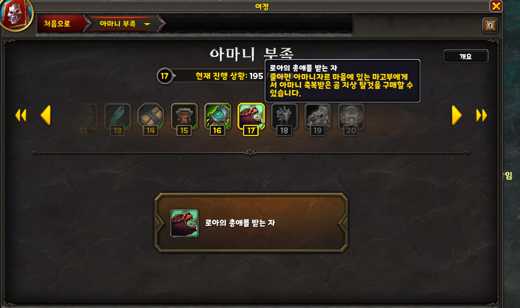부캐 냥꾼으로 줄아만 지역의 사이드 퀘스트들 중 마지막 하나 남은 것을 마무리하면서 보상으로 '아마니 부족' 평판을 얻으며 영예 17을 달성했습니다.