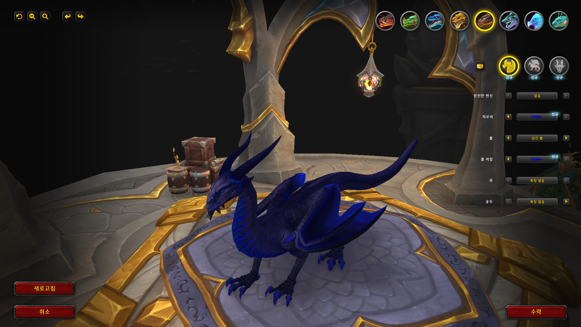 뿔 긴 걸로 바꾸고 안장 빼고 공허 100% 용조련술 탈것으로 꾸몄습니다. 피부색, 뿔 색깔, 눈 색깔 등 모두 공허색으로 바꿀 수 있습니다.