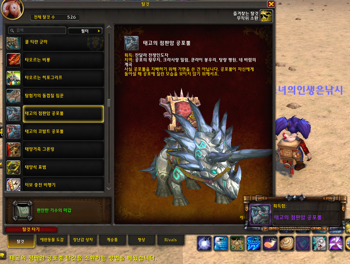 판다리믹스 출시 기념으로 용군단 캐릭터로 이 공포뿔 탈것 3종을 획득하기 위해 보이는대로 쓰러뜨렸습니다.