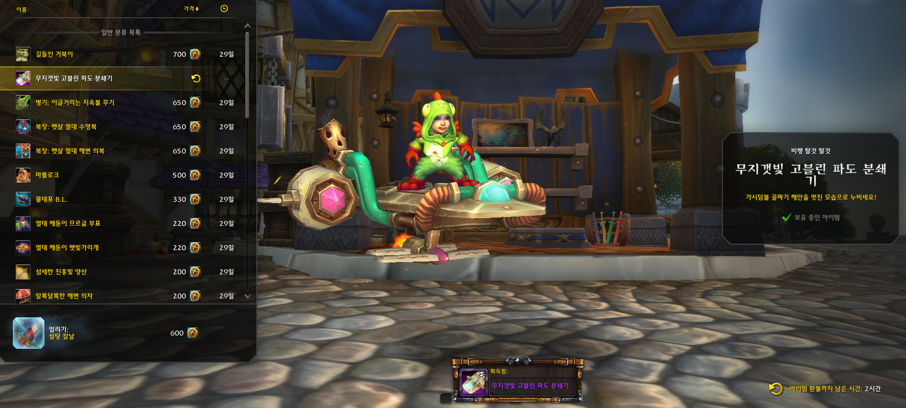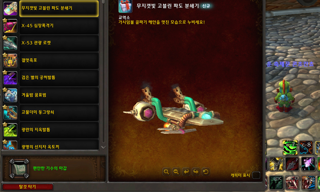 저번달 말에 상품 정보가 나와서 미리 알게되었는데 이 '무지갯빛 고블린 파도 분쇄기' 탈것이 궁금했습니다.