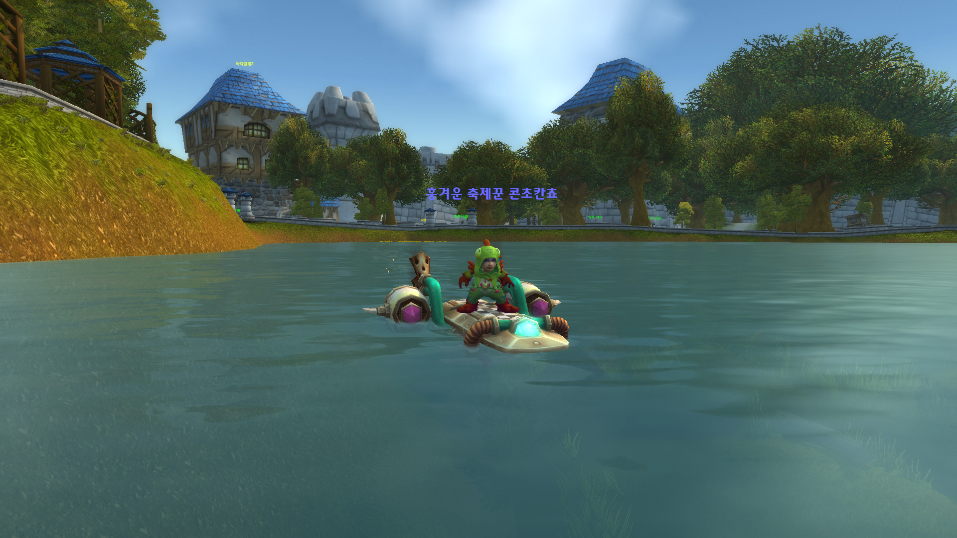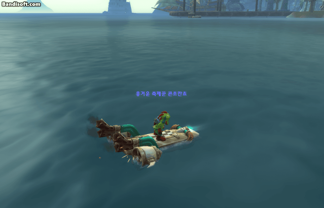 버프 설명에 '파도타기 중!'이라고 적혀있는데, 정말 신기하게도 탈것을 수면에 가까이 위치하면 뭔가 착 붙는 느낌으로 이렇게 다른 탈것들과 달리 파도를 탈 수 있습니다! (보이지 않는 파도)