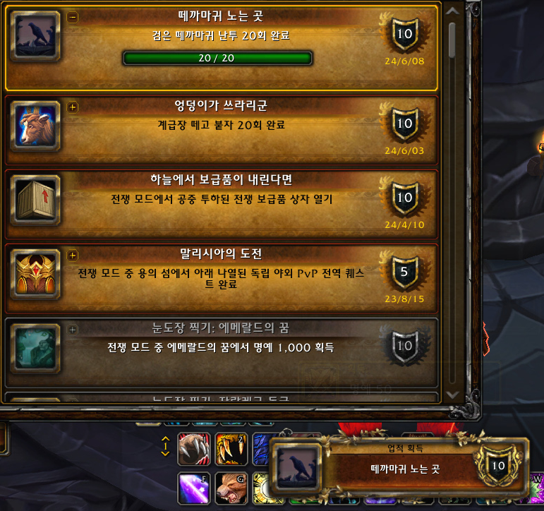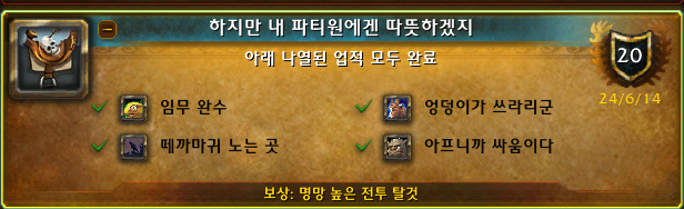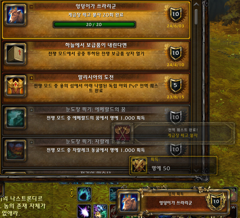 와우 군단 부서진 섬 지역에 pvp 전역퀘가 있습니다. 아즈스나 '작전명: 멀록의 자유', 발샤라 '검은 떼까마귀 난투', 높은산 '어둠브룰 투기장', 스톰하이 '계급장 떼고 붙자' 전역퀘를 각각 20회 완료하면 [하지만 내 파티원에게 따뜻하겠지] 업적을 달성할 수 있고 탈것을 보상으로 줍니다. 4개의 pvp 전역퀘가 한번에 등장하는 것이 아니라 8시~1시59분, 2시~7시59분마다 전역퀘 하나가 오픈되어 할 수 있습니다. 뜨는 것도 랜덤이라서 기간이 오래 걸립니다.