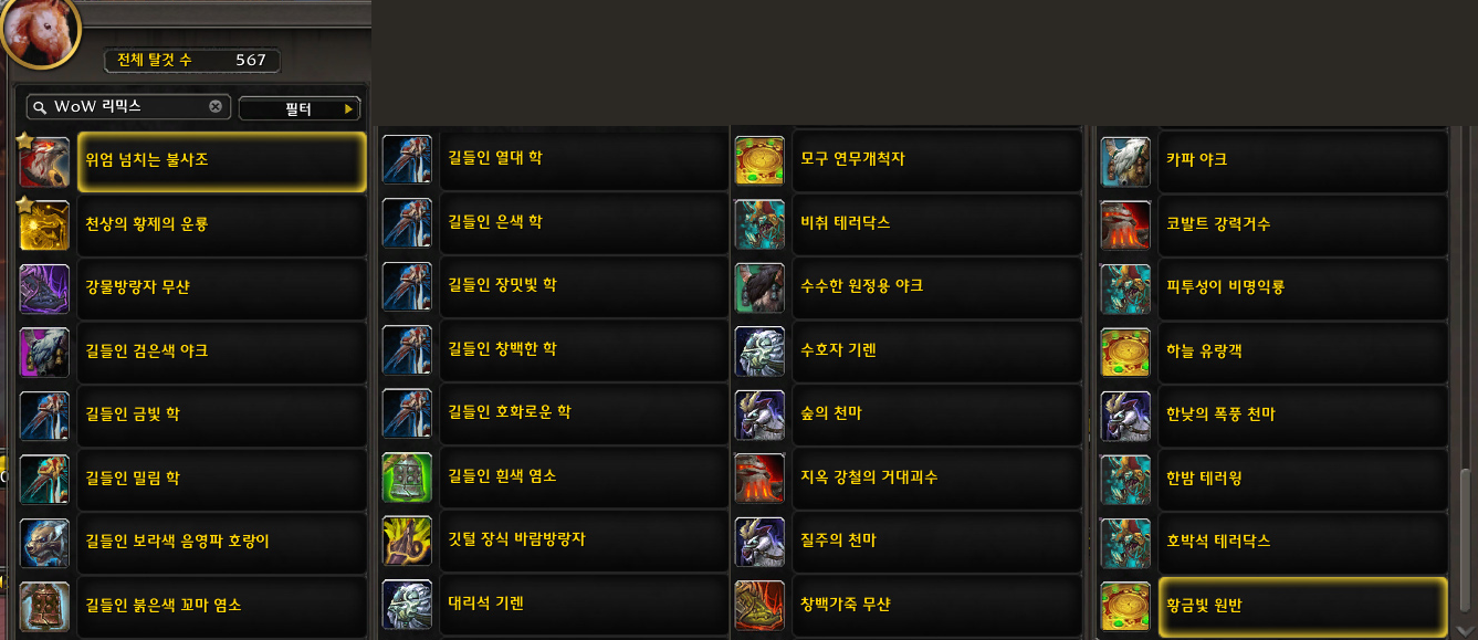 아래 이미지는 'WoW 리믹스'로 탈것 검색해서 뜬 32종의 기간한정 탈것 목록입니다. (업적 2종, 상점 30종)